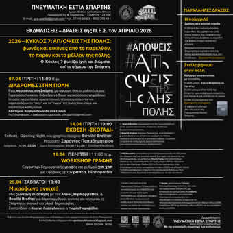 123 & Θερμοπυλών) Παρουσίαση του έργου του ζωγράφου σε επιμέλεια της Δρ. Γεωργίας Κακούρου-Χρόνη και της κ. Μόνικας Διαμαντή, Επιμελήτριας της Κουμανταρείου Πινακοθήκης/ΕΠΜΑΣ Παρασκευή, 28 Απριλίου Ώρα: 8:30 μ.μ. ΠΝΕΥΜΑΤΙΚΗ ΕΣΤΙΑ ΣΠΑΡΤΗΣ Αίθουσα εκδηλώσεων «Γεώργιος Περδικλώνης» (Λυκούργου 82 &