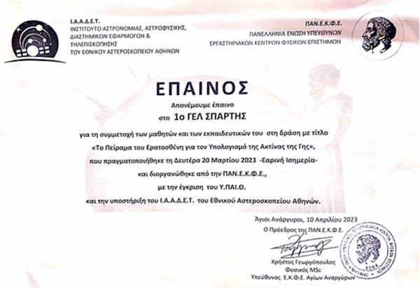 υποστήριξη του Ι.Α.Α.Δ.Ε.Τ. του Εθνικού Αστεροσκοπείου Αθηνών. Συγχαρητήρια στους μαθητές μας και στους εκπαιδευτικούς του σχολείου μας. Η
