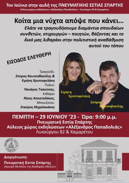 Αποστολάκος, και στο μπουζούκι: ο Σταύρος Μιχαλακάκος. ΠΝΕΥΜΑΤΙΚΗ ΕΣΤΙΑ ΣΠΑΡΤΗΣ Αύλειος χώρος εκδηλώσεων «Αλέξανδρος