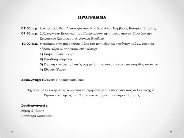 ΝΟΜΙΚΟ ΠΡΟΣΩΠΟ ΠΟΛΙΤΙΣΜΟΥ & ΠΕΡΙΒΑΛΛΟΝΤΟΣ ΤΟΥ ΔΗΜΟΥ ΣΠΑΡΤΗΣ ΠΡΟΣΚΛΗΣΗ Σας προσκαλούμε στην: «Εκδήλωση μνήμης Πρινοκοκκά και σφαγιασθέντων αγωνιστών από