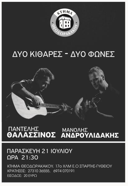 Ο αγαπημένος τραγουδοποιός Παντελής Θαλασσινός και ο σπουδαίος συνθέτης και κιθαρίστας Μανόλης Ανδρουλιδάκης μαζί σε μια συναυλία για «2 κιθάρες - 2 φωνές»! Η ιδιαίτερη ερμηνεία του Παντελή Θαλασσινού και το εκπληκτικό παίξιμο του Μανόλη Ανδρουλιδάκη στην κιθάρα, θα σας χαρίζουν μία αξέχαστη μουσική βραδιά με αγαπημένα τραγούδια από την προσωπική τους δισκογραφία, αλλά και τραγούδια των σημαντικότερων Ελλήνων δημιουργών. Η συναυλία θα πραγματοποιηθεί την Παρασκευή 21 Ιουλίου και ώρα 21:30 στο Κτήμα Θεοδωρακάκου. Σε όλη τη διάρκεια της βραδιάς θα απολαμβάνετε ελεύθερα και χωρίς επιπλέον χρέωση τα κρασιά του Κτήματος Θεοδωρακάκου, από τα κλασικά Κυδωνίτσα και Μαυρούδι έως το μοντέρνο Ροζέ ΚΑ, συνοδευόμενα από ελαφρά σνακ. Είσοδος: 20 ευρώ. Κρατήσεις στα τηλέφωνα 2731036555 και 6974070191.![]()