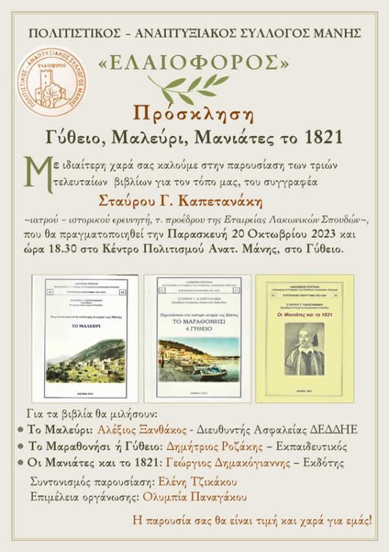 2023 και ώρα 18.30 στο Κέντρο Πολιτισμού Ανατολικής Μάνης, στο Γύθειο. Τα βιβλία θα