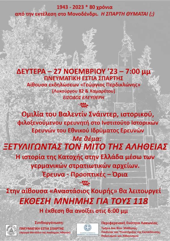 της αλήθειας. Η ιστορία της Κατοχής στην Ελλάδα μέσω των γερμανικών στρατιωτικών αρχείων. Έρευνα - Προοπτικές - Όρια» Ομιλία του ιστορικού κ. Βαλεντίν Σνάιντερ, φιλοξενούμενου ερευνητή στο Ινστιτούτο Ιστορικών Ερευνών του Εθνικού Ιδρύματος Ερευνών ΠΝΕΥΜΑΤΙΚΗ ΕΣΤΙΑ ΣΠΑΡΤΗΣ Αίθουσα εκδηλώσεων «Γεώργιος Περδικλώνης» (Λυκούργου 82 & Χαμαρέτου) Οργάνωση: Πνευματική Εστία Σπάρτης Τετάρτη, 29 Νοεμβρίου Ώρα: 7:00 μ.μ. Ξενάγηση στην Έκθεση Μνήμης για τους 118, σε συνδιοργάνωση της Περιφερειακής Ενότητας Λακωνίας (Τμήμα Δια Βίου Μάθησης, Παιδείας και Υποστήριξης της Εκπαίδευσης,
