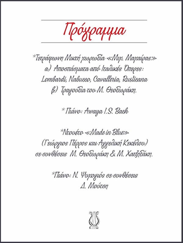 μικτή χορωδία «Μιχ. Μαχαίρας», στο πιάνο η Amaya, το ντουέτο «Made in Blue» και