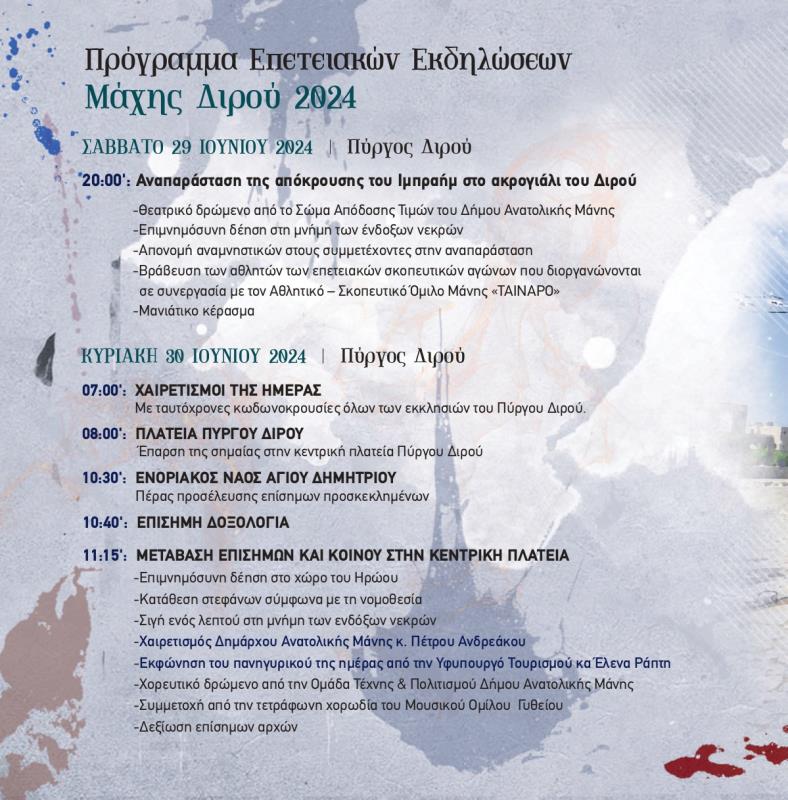 Σάββατο 29 και την Κυριακή 30 Ιουνίου 2024 στον Πύργο Διρού. Πρόγραμμα Επετειακών Εκδηλώσεων Μάχης