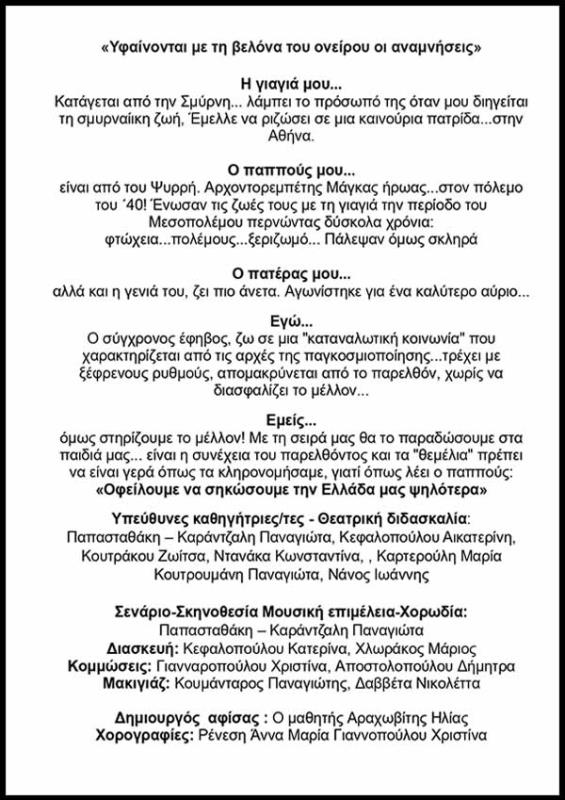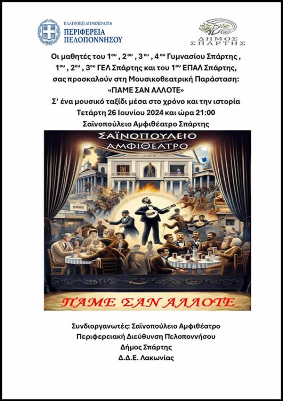 Σας προωθούμε ηλεκτρονικά την πρόσκληση που αφορά στην Μουσικοθεατρική παράσταση «Πάμε σαν Άλλοτε», που θα πραγματοποιηθεί την Τετάρτη 26 Ιουνίου 2024 και ώρα 21:00 στο Σαϊνοπούλειο Αμφιθέατρο των εξής σχολείων της Δευτεροβάθμιας Εκπαίδευσης Λακωνίας: