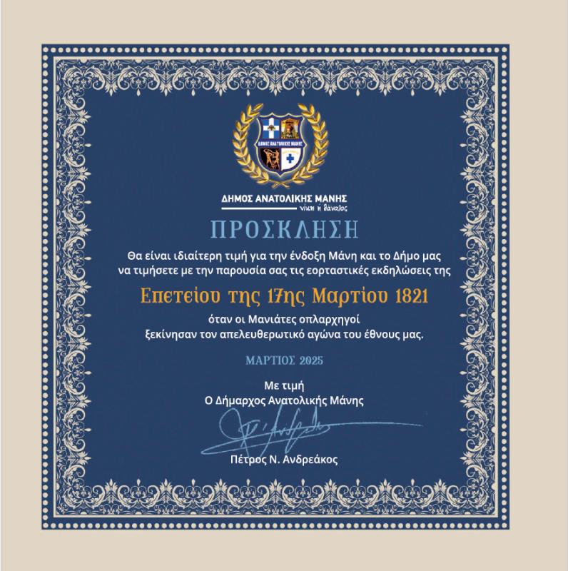 Ανατολικής Μάνης ΚΑΤΑ ΤΟ ΠΕΝΘΗΜΕΡΟ 13 ΕΩΣ17 ΜΑΡΤΙΟΥ 2025 Γενικός σημαιοστολισμός δημοσίων, δημοτικών,