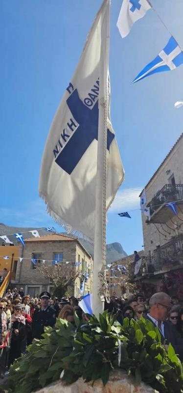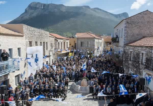 κωδωνοκρουσίες των εκκλησιών της Αρεόπολης. Ακολούθησε έπαρση της σημαίας στην