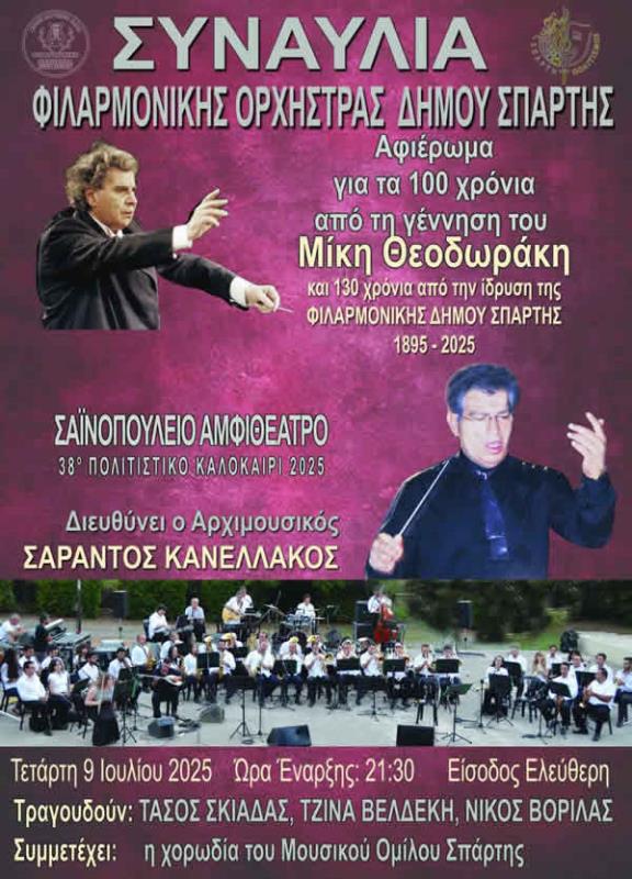 Ιουλίου & ώρα 9.30μ.μ. Η Φιλαρμονική Ορχήστρα Δήμου Σπάρτης με τον