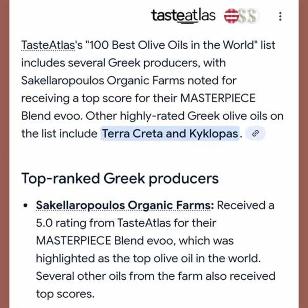 the World) καθώς και στα κορυφαία ελαιόλαδα της Ελλάδας (Best Greek Olive Oils & Producers), με βαθμολογία (Rate) 5 στα 5 για το gourmet ελαιόλαδο τους MASTERPIECE Blend evoo. Να σημειωθεί ότι το gourmet ελαιόλαδο MASTERPIECE blend