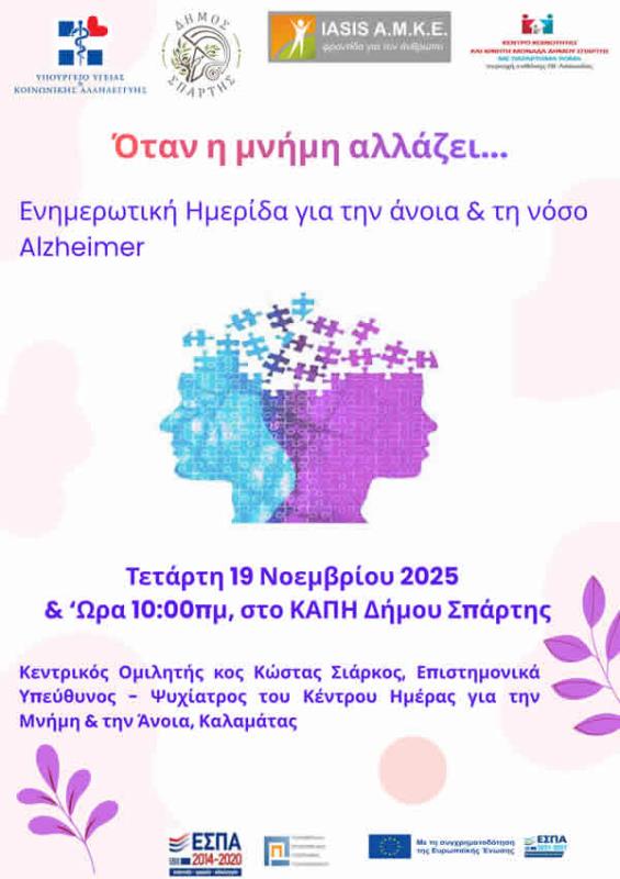 Κεντρικός ομιλητής θα είναι ο κ. Κώστας Σιάρκος, Ψυχίατρος και Επιστημονικά Υπεύθυνος του Κέντρου Ημέρας για την Μνήμη & την Άνοια Καλαμάτας