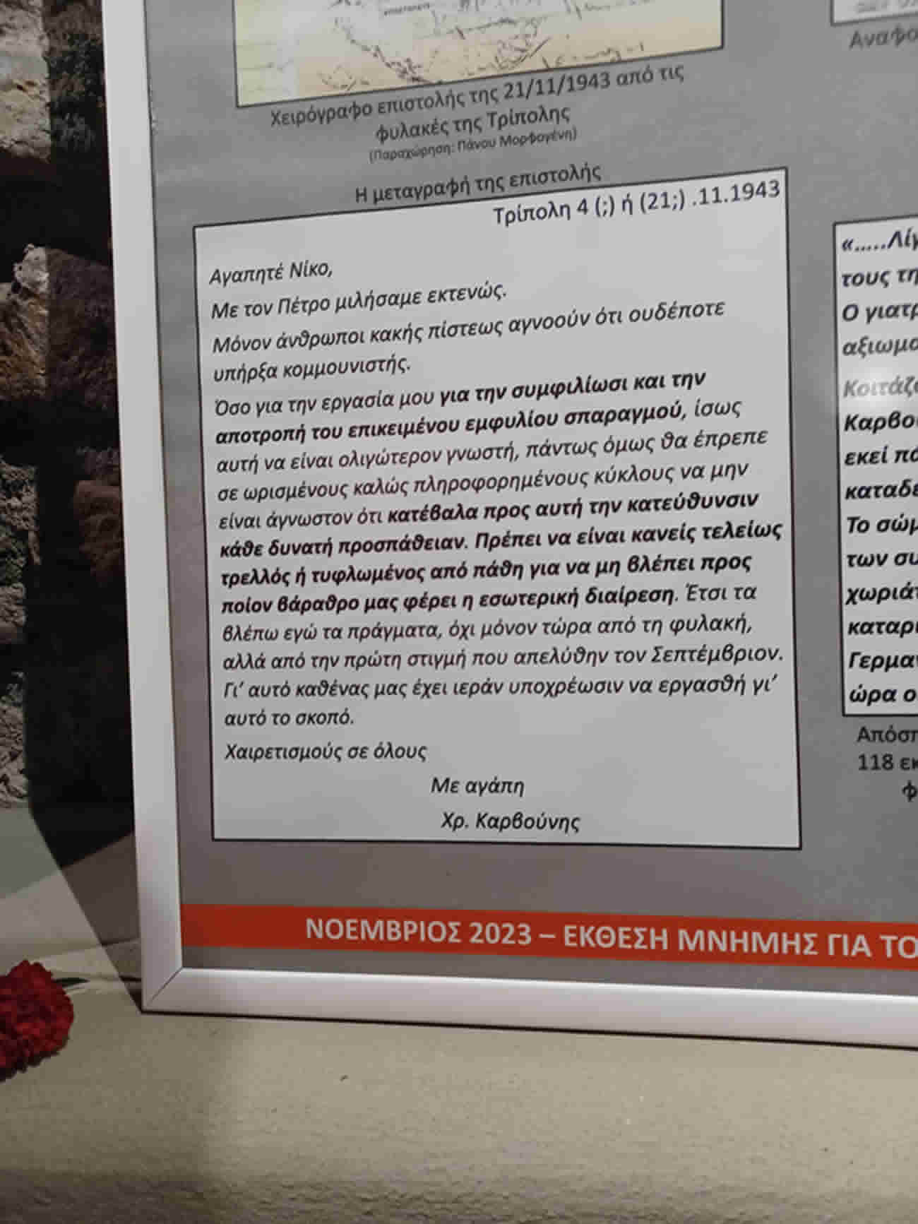 στις 21.11.1943, από τις φυλακές της Τρίπολης, ο ίδιος ο γιατρός Καρβούνης,