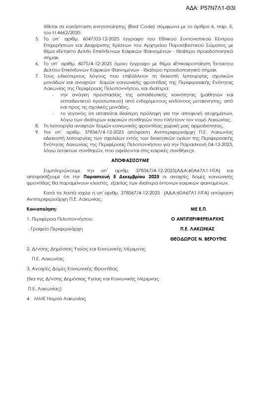 την υπ’αρ.πρωτ.378567/04-12-2025 Απόφαση του Αντιπεριφερειάρχη Π.Ε. Λακωνίας αποφαίσυηκε η διακοπή λειτουργίας των σχολείων εντός των διοικητικών ορίων της Π.Ε.