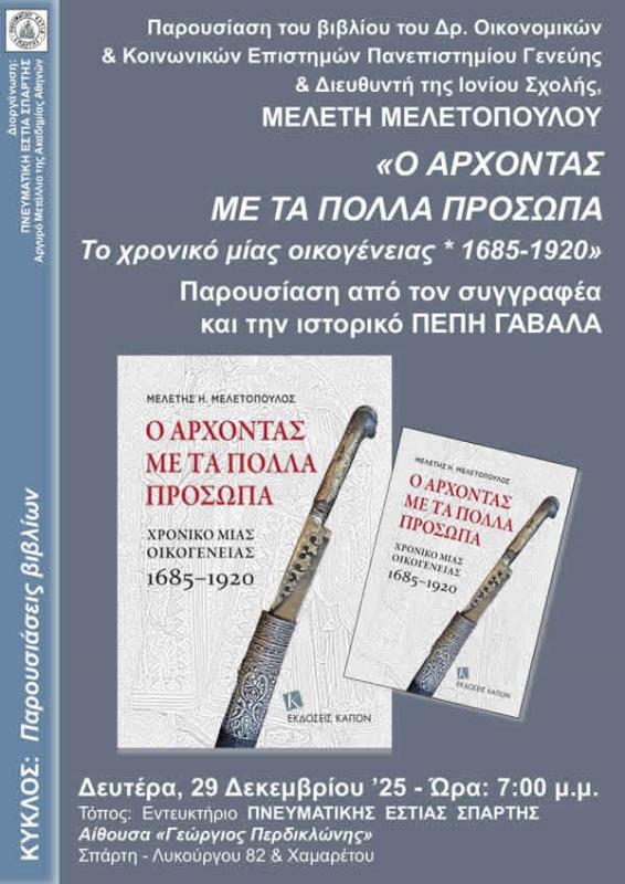 Την Δευτέρα, 29 Δεκεμβρίου ’25 στις 7:00 μ.μ. οι εκδηλώσεις της Πνευματικής Εστίας Σπάρτης του 2025 θα κλείσουν με την παρουσίαση του βιβλίου, «Ο Άρχοντας με τα Πολλά Πρόσωπα - Το χρονικό μιας οικογένειας, 1685-1920», που το έχει συγγράψει ο Δρ. Οικονομικών & Κοινωνικών Επιστημών Πανεπιστημίου Γενεύης & Διευθυντής της Ιονίου Σχολής, ΜΕΛΕΤΗΣ ΜΕΛΕΤΟΠΟΥΛΟΣ. Η παρουσίαση θα γίνει από τον συγγραφέα και την ιστορικό και αντιπρόεδρο της Π.Ε.Σ. ΠΕΠΗ ΓΑΒΑΛΑ. Διαβάζοντας το βιβλίο αυτό παρακολουθείς εκτός από την ιστορία μίας οικογένειας και την ιστορία ενός έθνους, του Ελληνικού, όπου κυριαρχούν ο έρωτας και ο πόλεμος, τα πάθη και η εκδίκηση. Λίγα λόγια για το βιβλίο Ο Μελέτης Μελετόπουλος αφηγείται την ιστορία