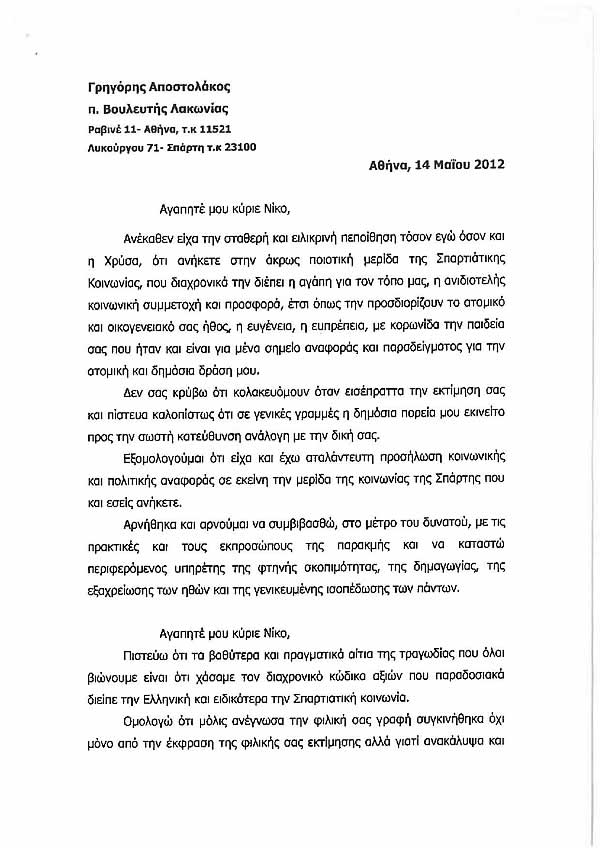 Από τον κ. Γρηγόρη Αποστολάκο, πρώην βουλευτή Λακωνίας, λάβαμε το ακόλουθο μήνυμα το οποίο και δημοσιεύουμε αυτούσιο. «Αγαπητέ κύριε Διευθυντά, Πριν 8 χρόνια μετά την μη εκλογή μου ως Βουλευτή ο