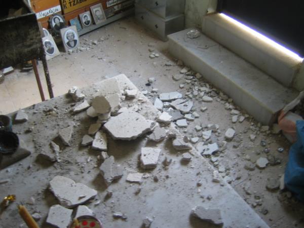 μεγάλο μέρος του σοβά της οροφής είχε καταρρεύσει μαζί με το φωτιστικό (ευτυχώς