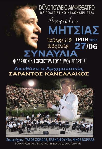 ΜΑΝΩΛΗ ΜΗΤΣΙΑ και την ΦΙΛΑΡΜΟΝΙΚΗ ΟΡΧΗΣΤΡΑ ΔΗΜΟΥ ΣΠΑΡΤΗΣ». Τη συναυλία θα