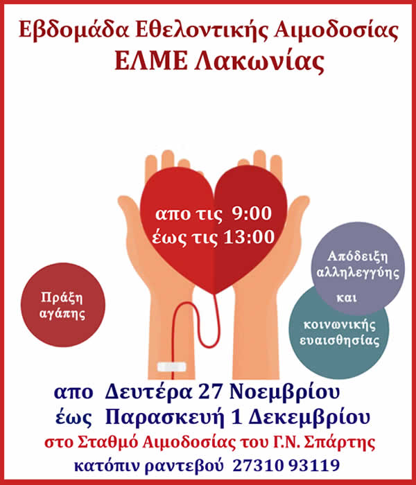 συνεργασία με το Γενικό Νοσοκομείο Σπάρτης διοργανώνει εβδομάδα ΕΘΕΛΟΝΤΙΚΗΣ