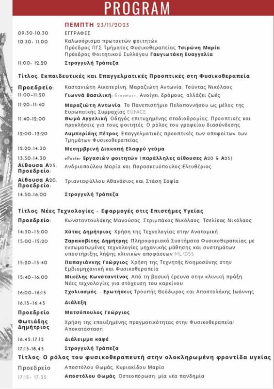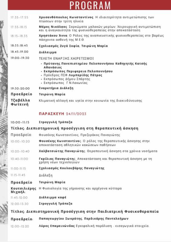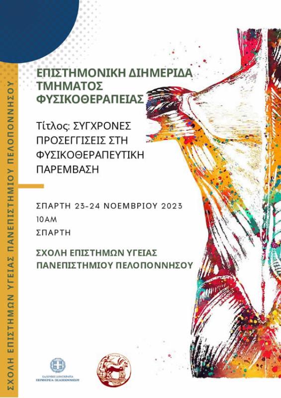 Επιστημονική Διημερίδα στις 23 και 24 Νοεμβρίου 2023 με τίτλο: «Σύγχρονες προσεγγίσεις στη Φυσικοθεραπευτική παρέμβαση» Στην Επιστημονική Διημερίδα θα δοθούν διαλέξεις από