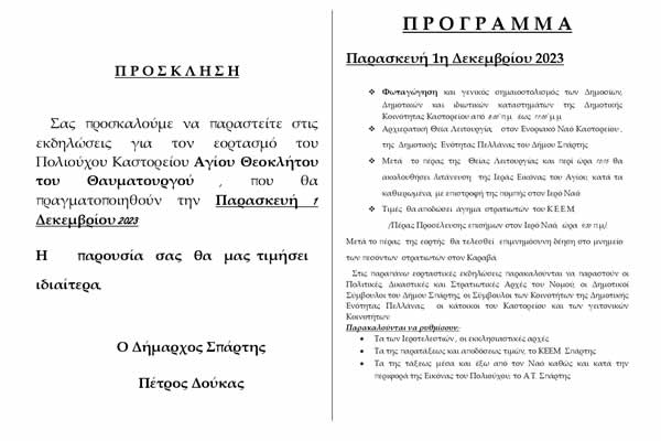 Ο Δήμος Σπάρτης σας προσκαλεί να παραστείτε στις εκδηλώσεις για τον εορτασμό του Πολιούχου Καστορείου Αγίου Θεοκλήτου, Αρχιεπισκόπου Λακεδαιμονίας, του Θαυματουργού που θα πραγματοποιηθούν την Παρασκευή 1η Δεκεμβρίου 2023.
