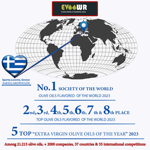 2023, με τη Νο.1 θέση στον κόσμο, ως παραγωγός γαστρονομικών ελαιολάδων Ανάμεσα σε 21,213 δείγματα ελαιολάδων, από 37 χώρες και 2000