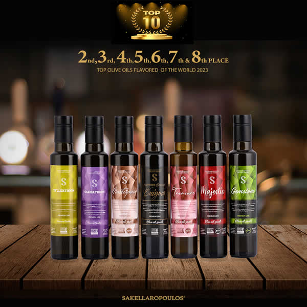 στον κόσμο ως εταιρεία - παραγωγός gourmet ελαιολάδων • Με 8 gourmet ελαιόλαδα στα TOP Flavored Oils of the Year 2023 παγκοσμίως • Τιμώνται με μια σπάνια επιβράβευση, κατακτώντας 7 στις 10