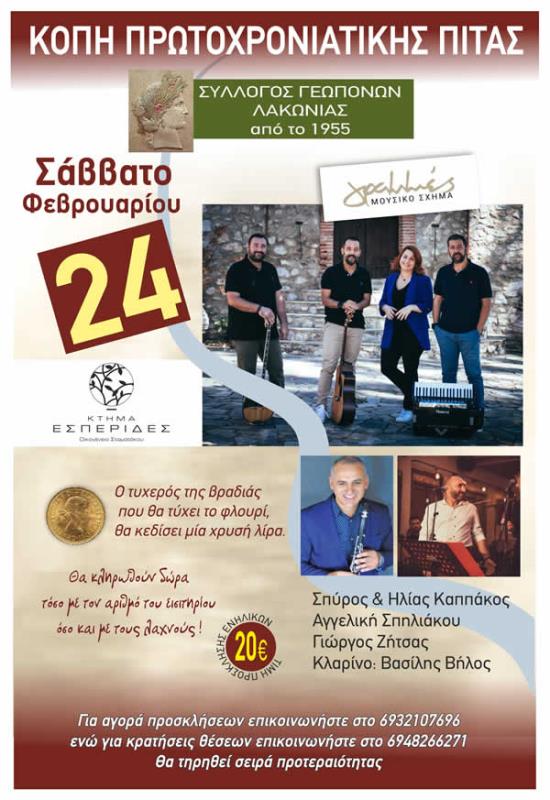 Σας ενημερώνουμε και σας προσκαλούμε στον ετήσιο χορό του Συλλόγου μας που θα λάβει χώρα στο Κέντρο Εσπερίδες στους Μολάους το Σάββατο 24/02/2024 με ώρα προσέλευσης 8:30 μ.μ. με είσοδο 20 Ευρώ.