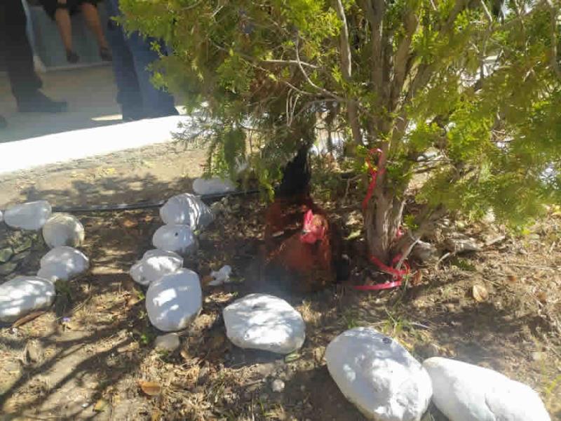 γιορτή του Α¨-Γιώργη. Σε δυο θάμνους βρίσκονται δυο κοτόπουλα στολισμένα με