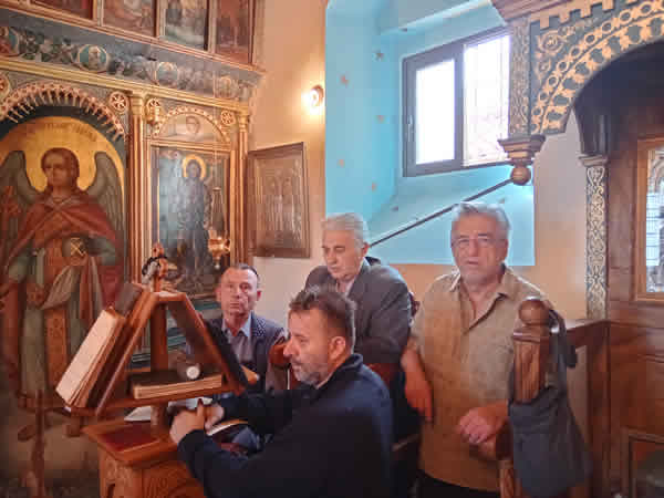 Μπουρλόκα, που είναι το δεξί του χέρι, και τους ιεροψάλτες Σταύρο Τσαρούχα και