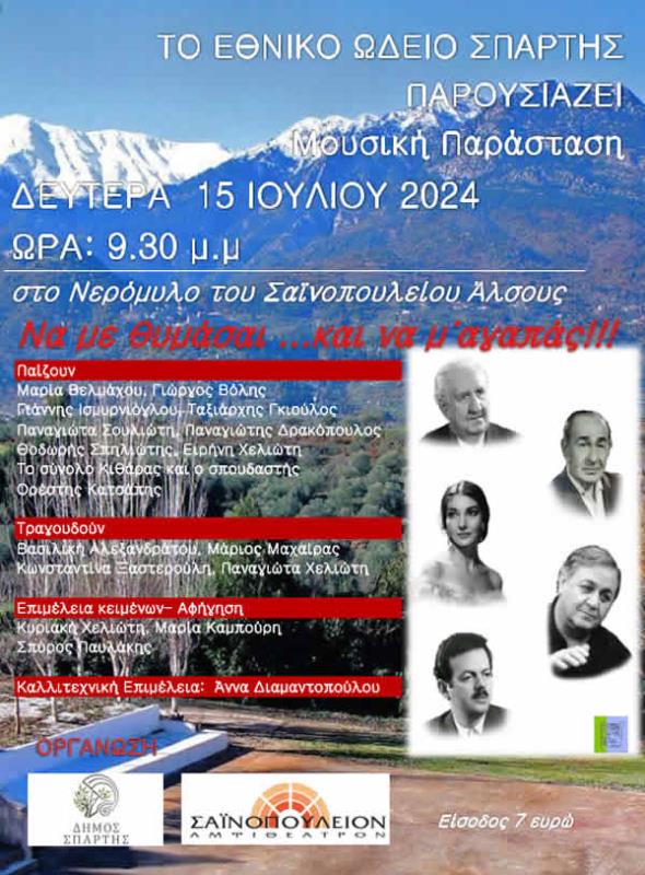 χώρο του «Νερόμυλου» που βρίσκεται εντός του Σαινοπουλείου Άλσους. Μικρό Θέατρο Σαϊνοπουλείου «Νερόμυλος» Δευτέρα, 15 Ιουλίου 2024 στις 21.30 Τιμή Εισιτηρίου 7€ ![]()