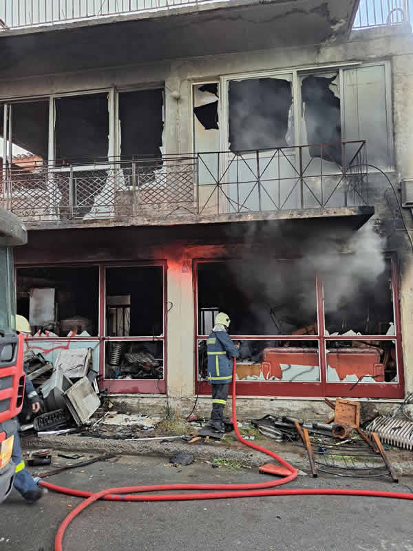 Η φωτιά επεκτάθηκε και σε παρακείμενο διώροφο κτίριο το οποίο υπέστη εκτεταμένες ζημιές