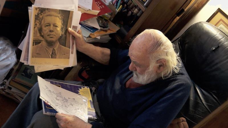 επιδεικνύει φωτογραφίες, παλιά του σχέδια, εκδόσεις. Ανακλάται στον