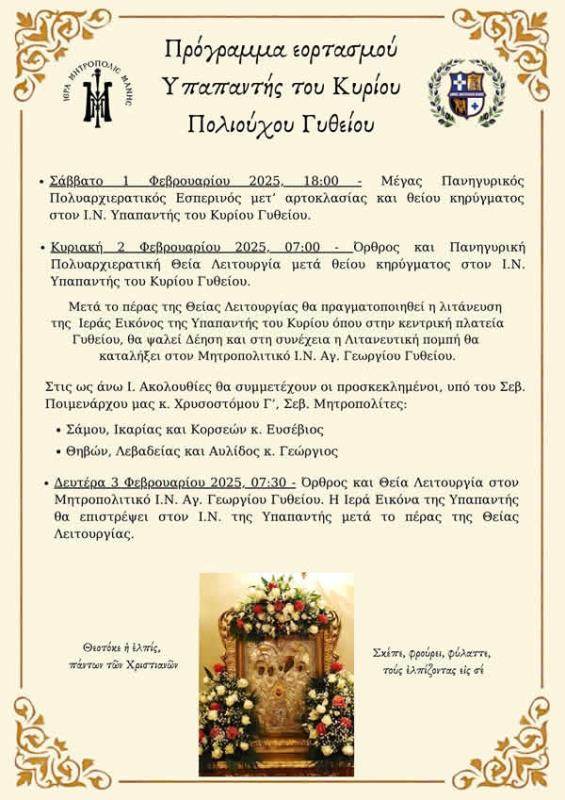 στον Ι.Ν. Υπάπαντής του Κυρίου στο Γύθειο. Κυριακή 2 Φεβρουαρίου 2025, 07:00 – Όρθρος και