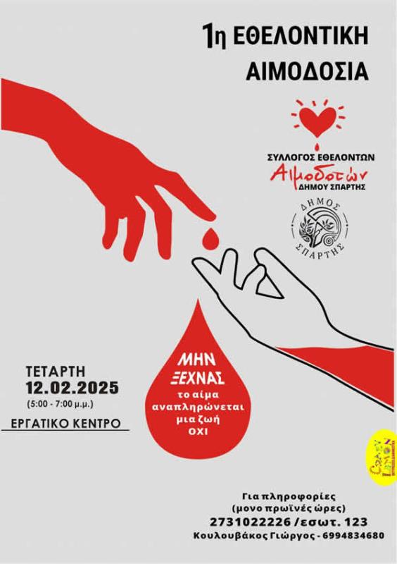 Αιμοδοσία, την Τετάρτη 12 Φεβρουαρίου στο Εργατικό Κέντρο Λακωνίας. Ειδικότερα, μετά την ίδρυση του Συλλόγου