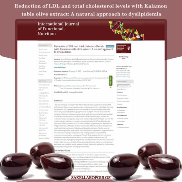 Δημοσιεύτηκε στο έγκριτο επιστημονικό περιοδικό International Journal of Functional Nutrition η κλινική μελέτη με τίτλο "Reduction of LDL and total cholesterol levels with Kalamon table olive extract: A natural approach to dyslipidemia" (Μείωση των επιπέδων LDL
