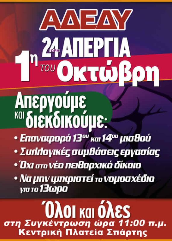 ΟΛΟΙ ΚΑΙ ΟΛΕΣ ΣΤΗΝ ΓΕΝΙΚΗ ΑΠΕΡΓΙΑ 1 ΟΚΤΩΒΡΗ ΟΛΟΙ ΚΑΙ ΟΛΕΣ ΣΤΗΝ ΣΥΓΚΕΝΤΡΩΣΗ 11:00 π.μ ΚΕΝΤΡΙΚΗ ΠΛΑΤΕΙΑ ΣΠΑΡΤΗΣ Τα προβλήματα μας είναι κοινά, αγωνιζόμαστε