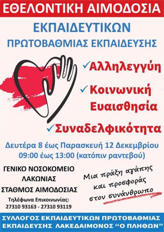Σταθμό Αιμοδοσίας του Γενικού Νοσοκομείου Λακωνίας στη Σπάρτη. Η προσέλευση γίνεται με ραντεβού στα τηλέφωνα