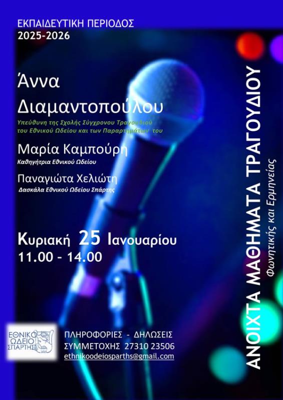 ΚΥΡΙΑΚΗ 25 ΙΑΝΟΥΑΡΙΟΥ 2026, ΩΡΑ 11.00-14.00 Ανοιχτά μαθήματα τραγουδιού (φωνητικής και ερμηνείας)