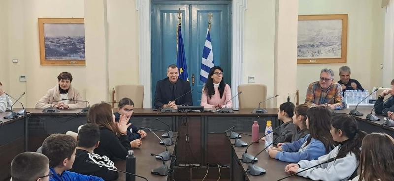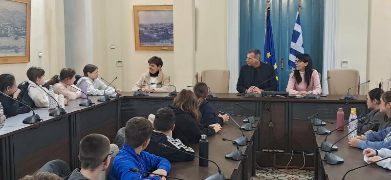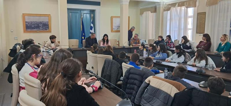Συνοδευόμενοι από την Διευθύντρια του σχολείου, κ. Ελένη Δαράκη και τις εκπαιδευτικούς κ.κ. Πολυτίμη Νικολακάκου και Μαρία Ψυκάκου, οι μικροί μαθητές, από τις θέσεις των Δημοτικών Συμβούλων, υπέβαλλαν τα ερωτήματά τους στον Δήμαρχο