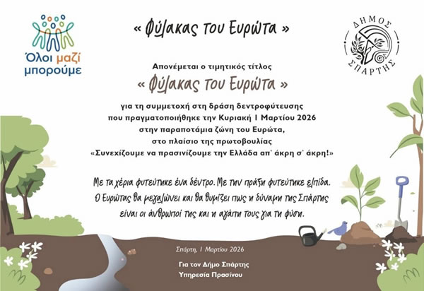 «Φύλακας του Ευρώτα» για τη συμμετοχή τους στη δενδροφύτευση και την αγάπη τους