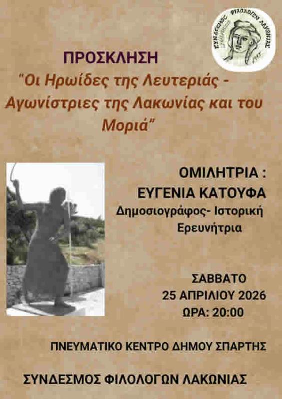 Ο Σύνδεσμος Φιλολόγων Λακωνίας σας προσκαλεί στην εκδήλωση-ομιλία με θέμα: «Οι Ηρωίδες της Λευτεριάς - Αγωνίστριες της