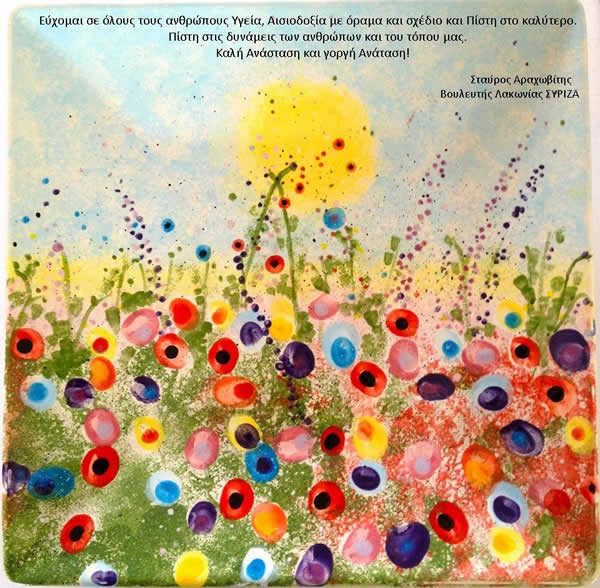 Βουλευτής Λακωνίας ΣΥΡΙΖΑ Εύχομαι από καρδιάς στους απανταχού Λάκωνες Καλό Πάσχα. Αυτές τις ημέρες η Αυτοθυσία του Κυρίου ας μας δείξει τον