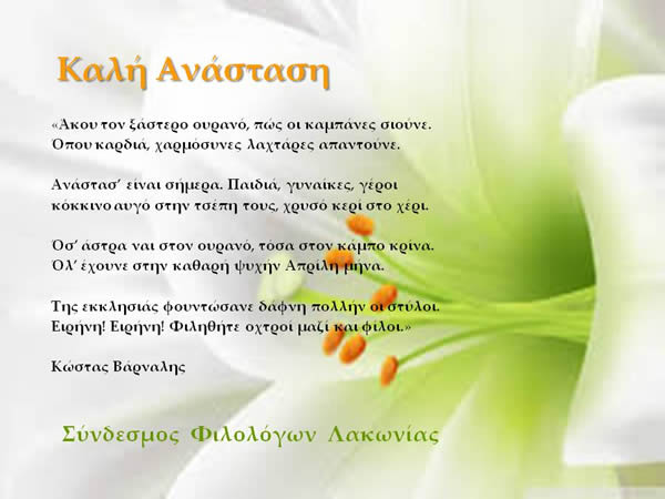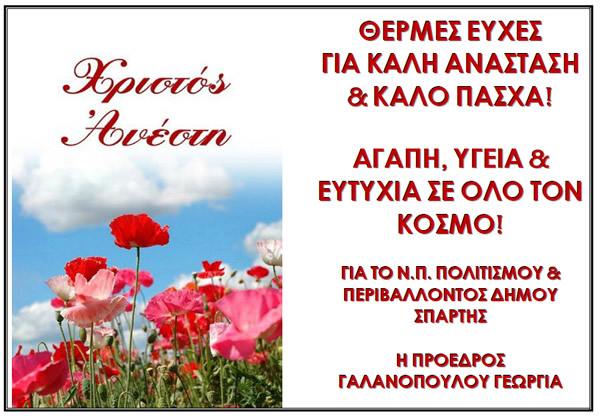 συνάνθρωπο μας. Χρόνια Πολλά και Καλή Ανάσταση! Η Αντιπεριφερειάρχης Λακωνίας Αδαμαντία Τζανετέα Ευχές της Μαντώς Μπελεγρή Εντετ. Συμβούλου Πολιτισμού - Τουρισμού Λακωνίας «Ολοι οι δρόμοι της